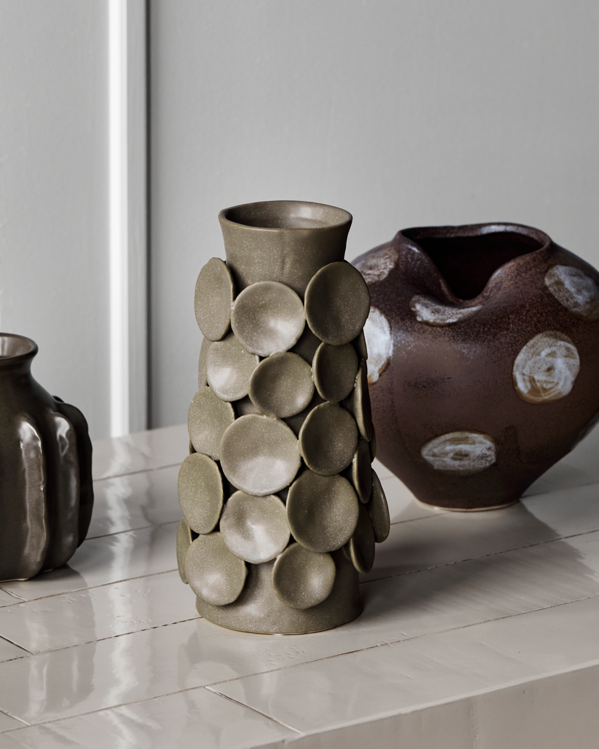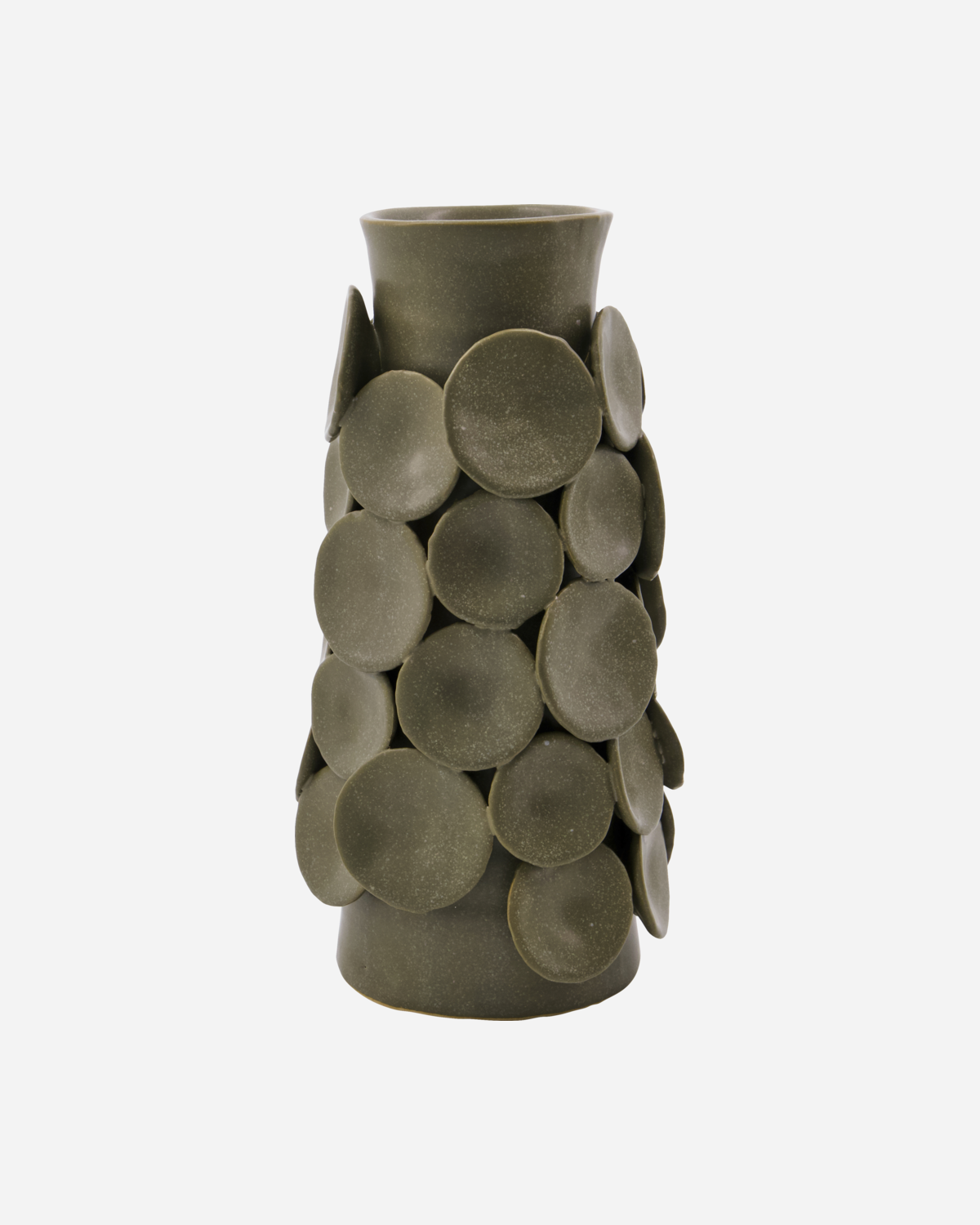 Chaki spalvos akmens masės vaza išsiskiria rankų darbo dekoratyviniais apskritimais, kurie paverčia ją tikru skulptūriniu meno kūriniu jūsų namuose. Matinis paviršius ir meniškos detalės suteikia gyvybingumo bei išskirtinio charakterio bet kuriam stalui, lentynai ar komodai.